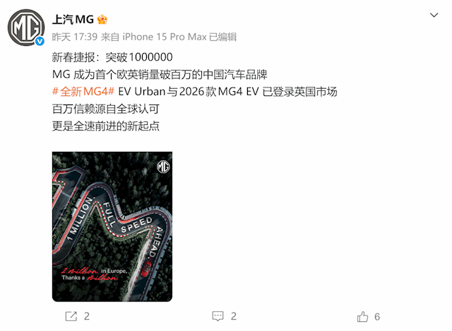 2025年,上汽MG在欧洲(含英国)销量施展强盛,欧洲举座销量打破30万辆,英国销量打破8.5万辆,均创历史新高。