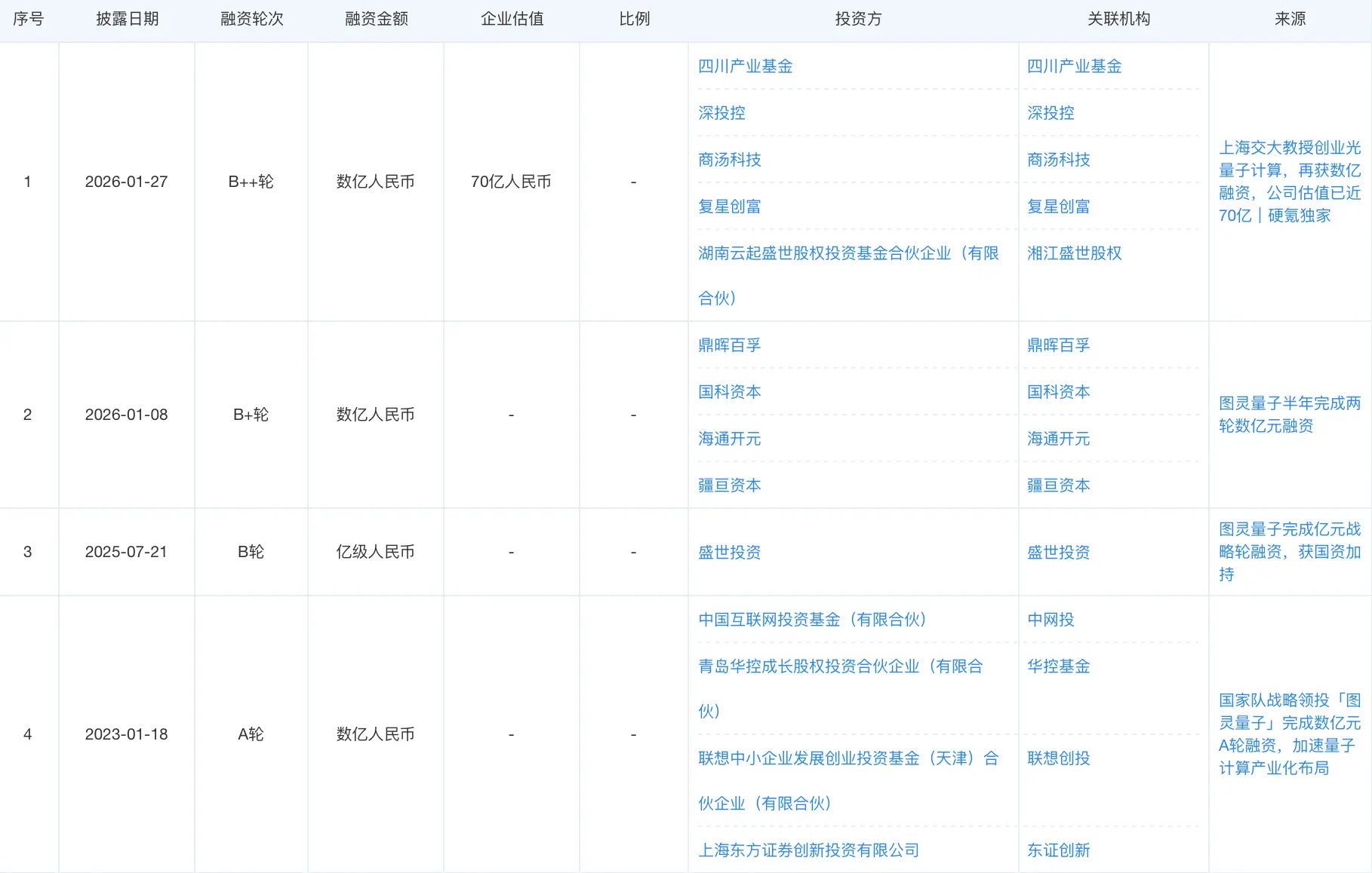 从融资规模来看,图灵量子在本年1月共完成2次规模为数亿元的融资,中间时候仅终结10天把握。1月8日,图灵量子秘书完成近亿元天神轮融资,由联思之星领投,中科神光、前海基金、源来本钱、小苗朗程跟投。同月的27日,图灵量子秘书完成数亿元B轮融资,由商汤科技、复星创富、深投控、川发伙同基金领投。
