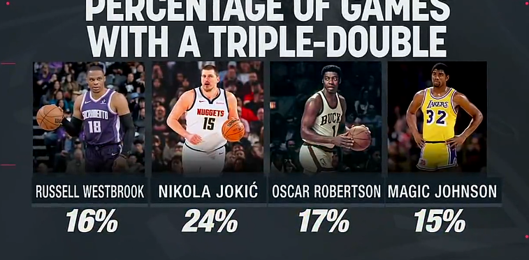 {jz:field.toptypename/}转播方列出数据,约基奇生计第185次三双,生计三双率高达24%。