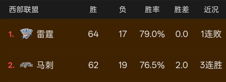 当前雷霆 64 胜,马刺 62 胜,就差 2 场成功,说近不近,说远也不远。