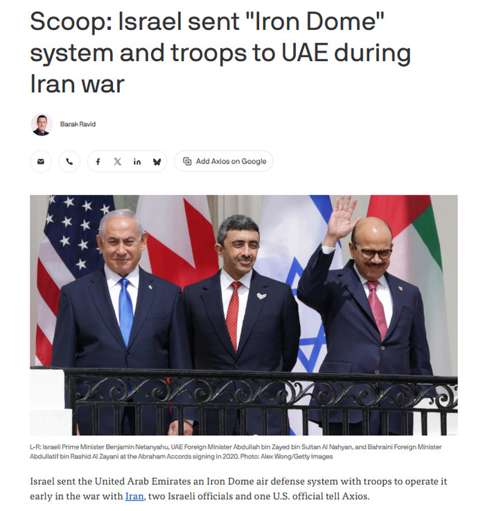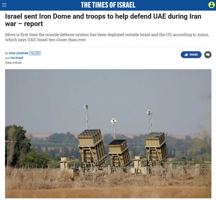 针对这次以色列将一套“铁穹”系统部署至阿联酋,阿克西奥斯新闻网报谈称,以色列和阿联酋之间的军事、安全和谍报合营在本轮冲突期间达到了新的高度。据一位以色列官员称,“铁穹”系统匡助阿联酋禁绝了数十枚伊朗导弹。
