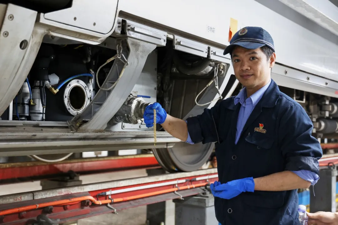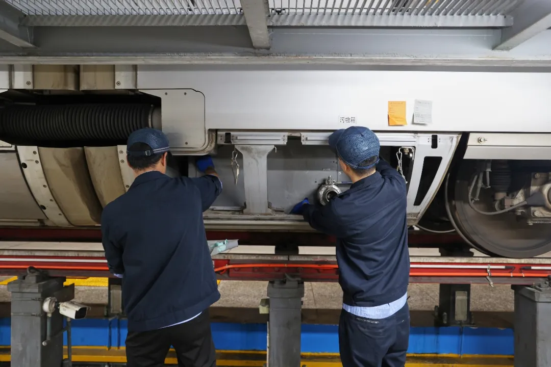 当晚8时28分,该趟回复号动车组列车驶入南宁动车所查验库,地勤机械师严芝科和搭档张浩早早就备好了器具材料,等候在一旁。
